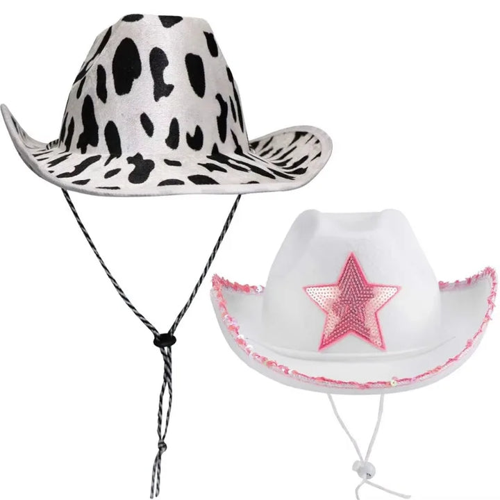 כובע קאובויPink Star White Cowgirl Hat Sequin Trim Fringe Cow Girl Hat Adjustable Woman Straw Hats for Women Western Partyקאובוי