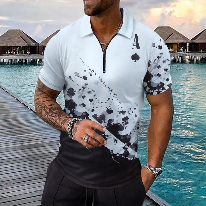 2024 Men's summer short sleeved lapel 3D digital printed striped polo shirt with fake pocket buckle men's business casual zipper