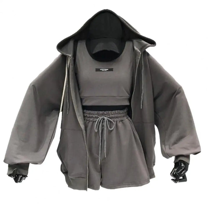 Pair this activewear set with sneakers for a stylish and dynamic look effortlessly. Embrace fashion, leisure, and fitness with our women's spring and autumn sports suit. Upgrade your activewear collection with this comfortable and trendy 3-piece running vest, hoodie, sweater, and shorts set.