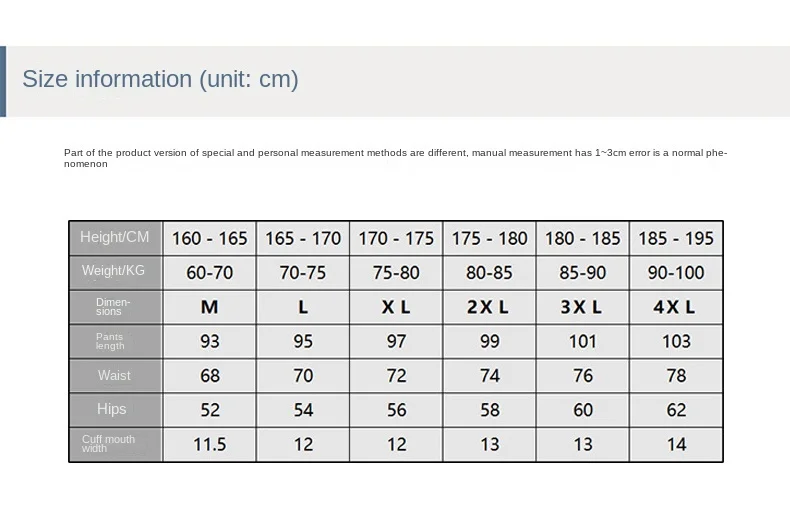 SPECIFICATIONSApplicable Scene: CASUALApplicable Season: Four SeasonsBrand Name: NoEnName_NullCN: FujianChoice: yesClosure Type: Elastic WaistCraft of Weaving: KnitDecoration: PocketsFabric Type: WoolenFabric process: softeningFit Type: RegularFront Style: FlatGender: MenHign-concerned Chemical: NoneItem Type: full lengthLength: Ankle-Length PantsMain fabric composition content: 100Material: POLYESTERModel Number: Y0626Origin: Mainland ChinaPant Style: STRAIGHTPlace Of Origin: China (mainland)Style: CasualSuitable for the season: Spring and Autumn, Winter, summerThickness: MidweightWaist Size(in inches): 2-3.5Waist Type: MIDapplicable gender: Unisex/Unisexelement: Sportsname: Multiple Occasions,Elastic waist,dropshipping,Super softpattern: solidsecurity level: Category Asize_info: {"sizeInfoList":[{"length":{"cm":"93","inch":"36.61"},"size":"M","vid":-1},{"length":{"cm":"95","inch":"37.40"},"size":"L","vid":-2},{"length":{"cm":"97","inch":"38.19"},"size":"XL","vid":-3},{"length":{"cm":"99","inch":"38.98"},"size":"2XL","vid":-4},{"length":{"cm":"101","inch":"39.76"},"size":"3XL","vid":-5},{"length":{"cm":"103","inch":"40.55"},"size":"4XL","vid":-6}]}style: Casual pants,Korean versiontrouser length: trouserswaistband: mid waist
