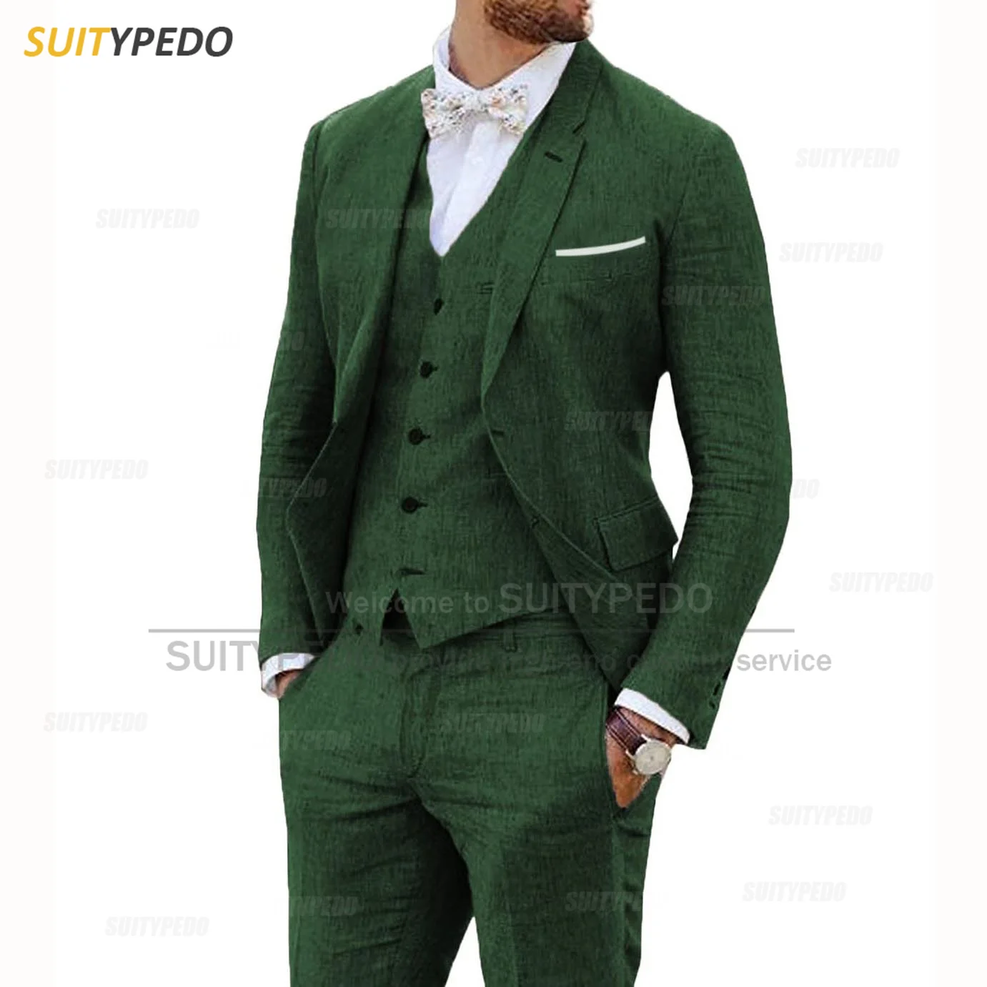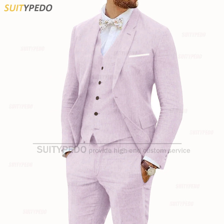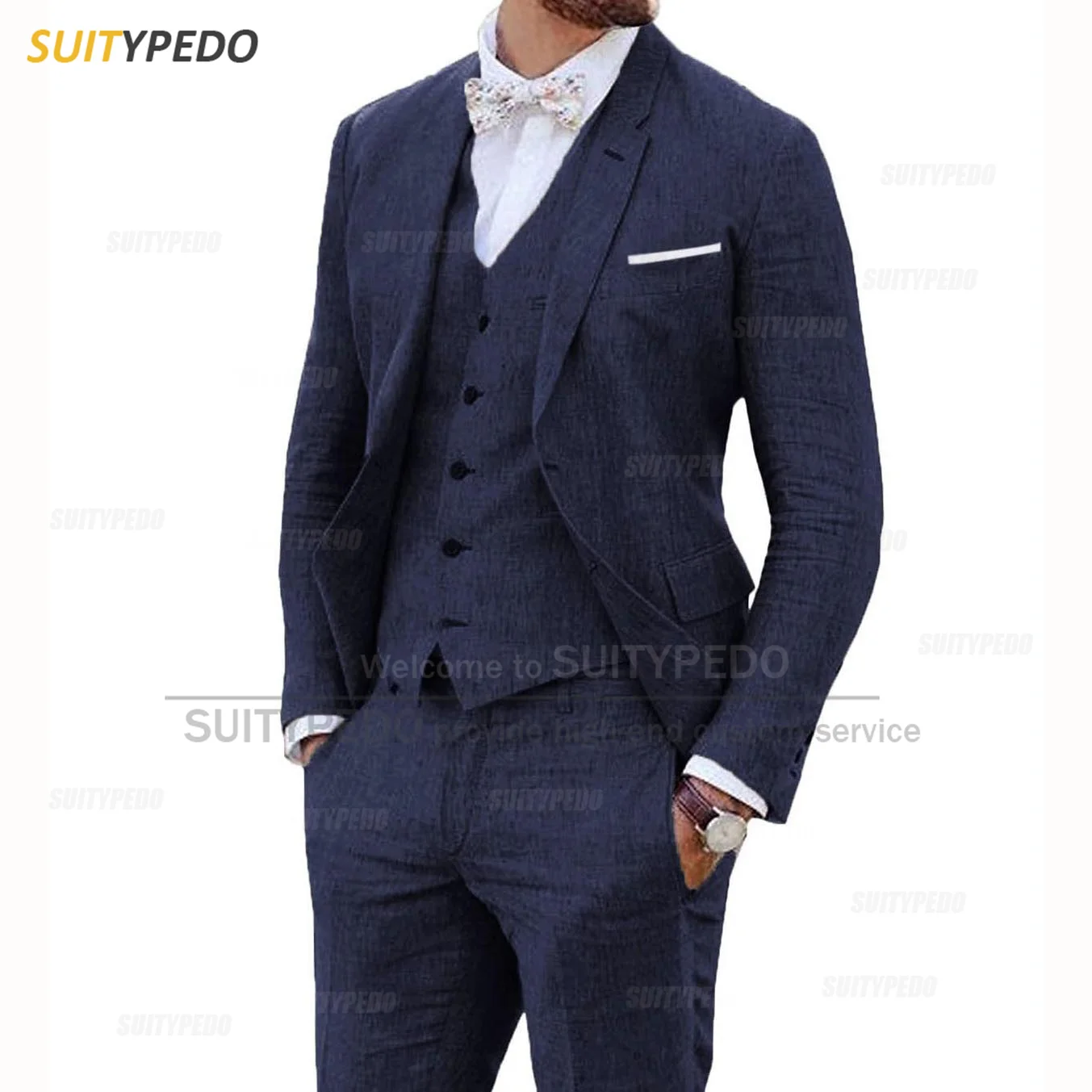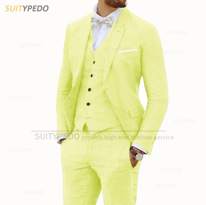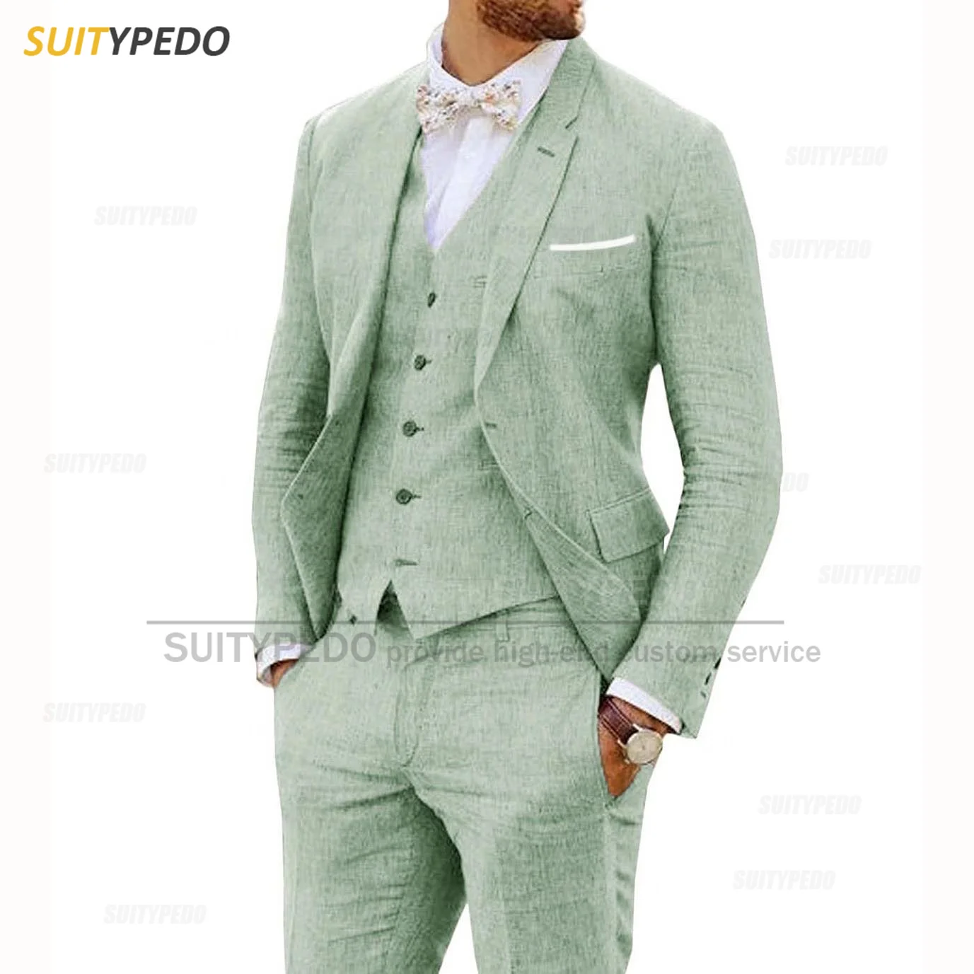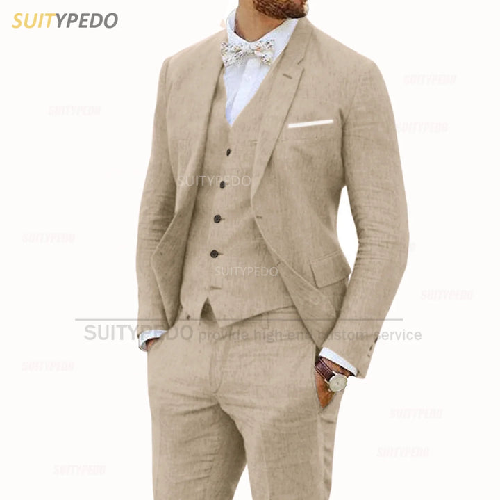 Beige Linen Suits for Men 3 Pieces Casual Slim Fit Suit Blazer Vest Pants Set Formal Prom Wedding Tuxedos for Groomsmen Best Man