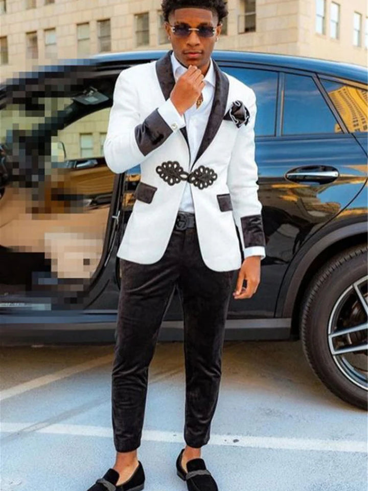 Black&White Jaquard Suits for Men 2 Pieces Slim Fit Young Man Prom Party Suit Velvet Wedding Tuxedos Trajes De Hombre Coat+Pant