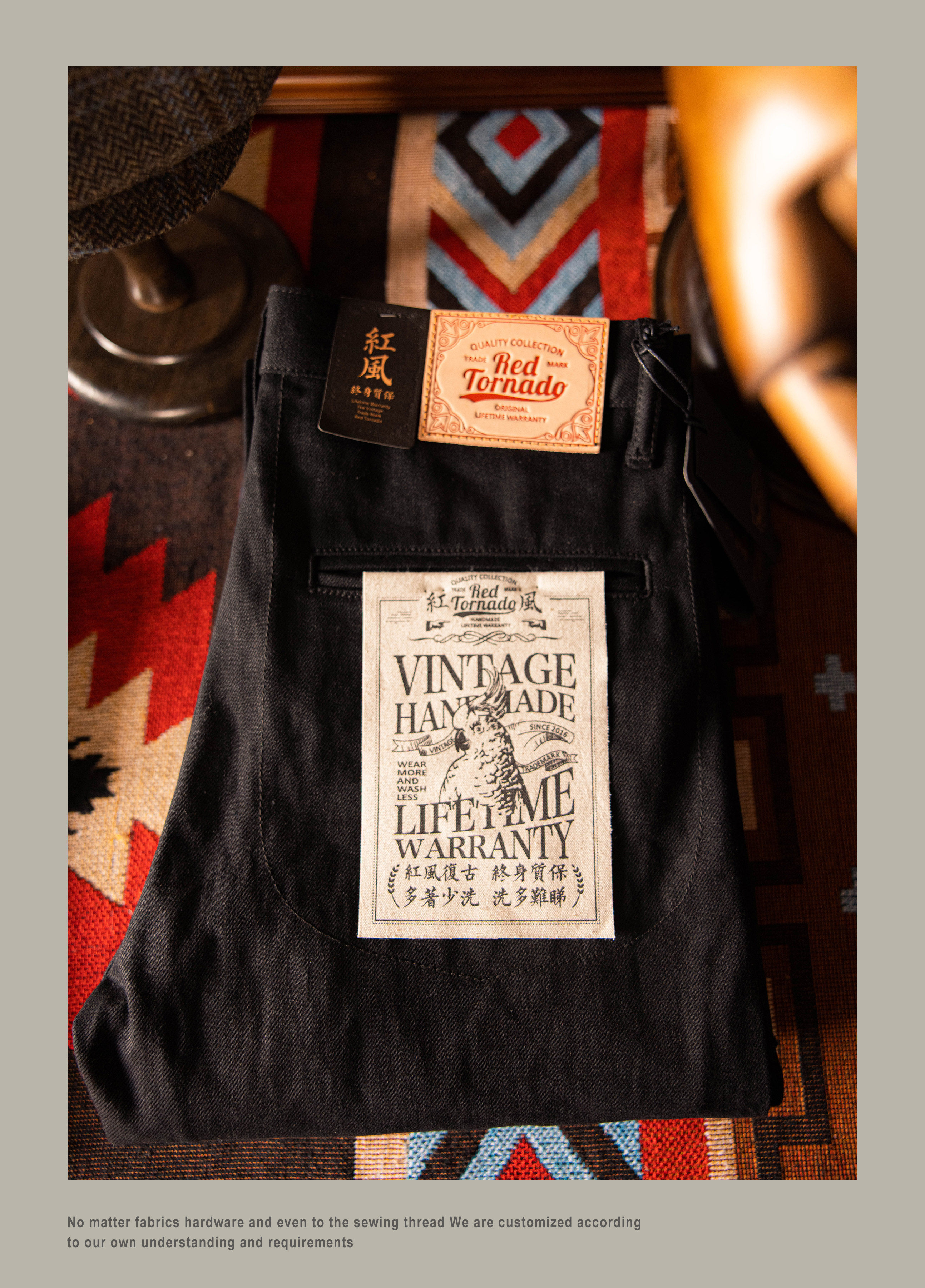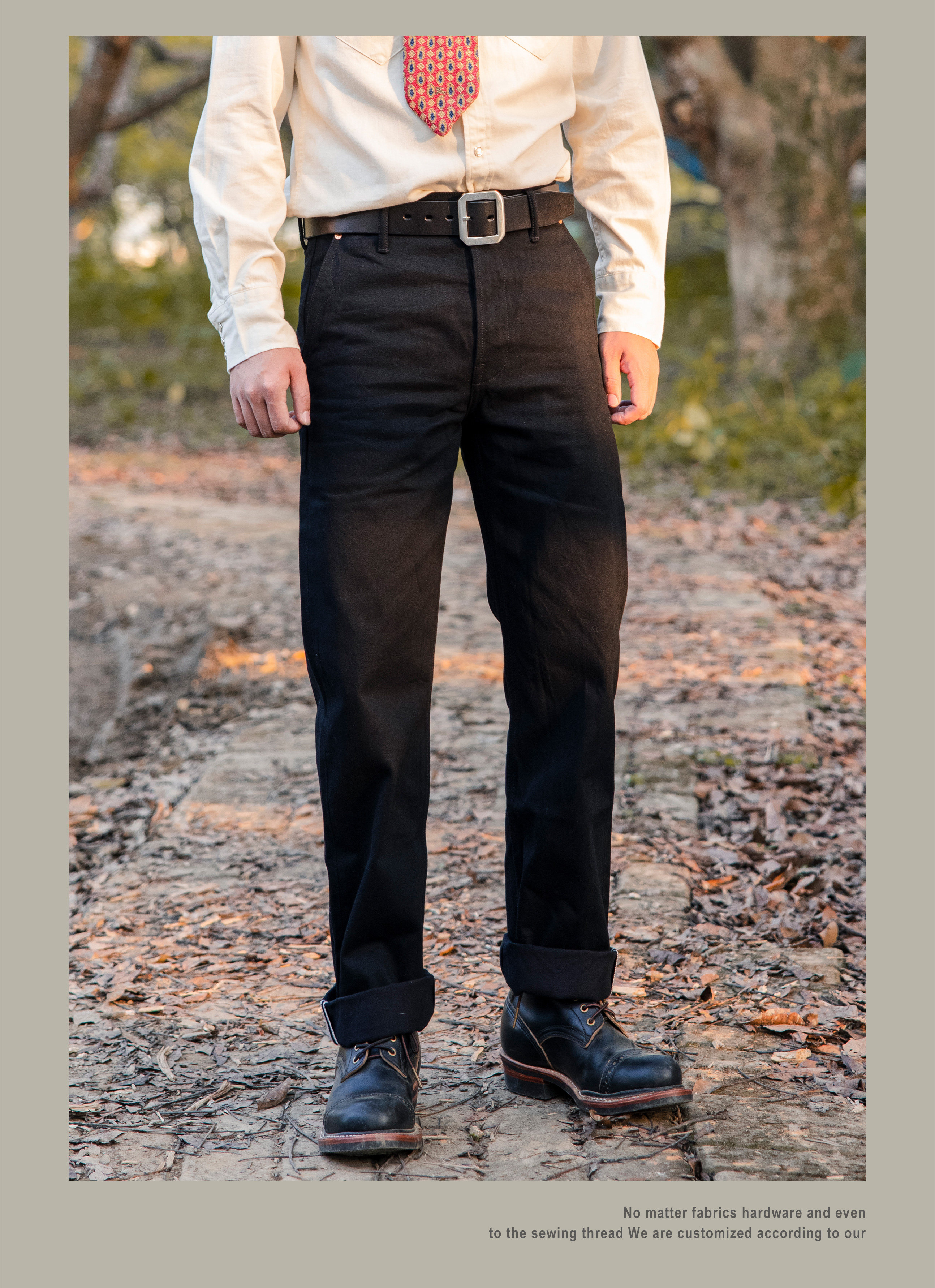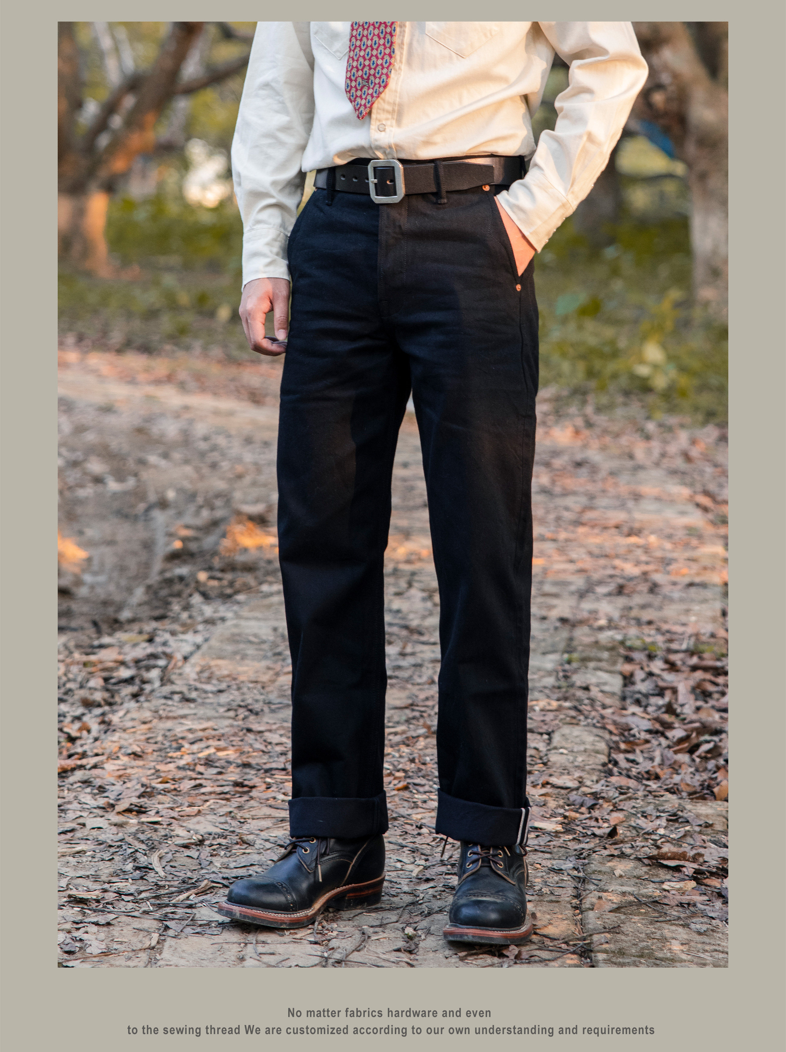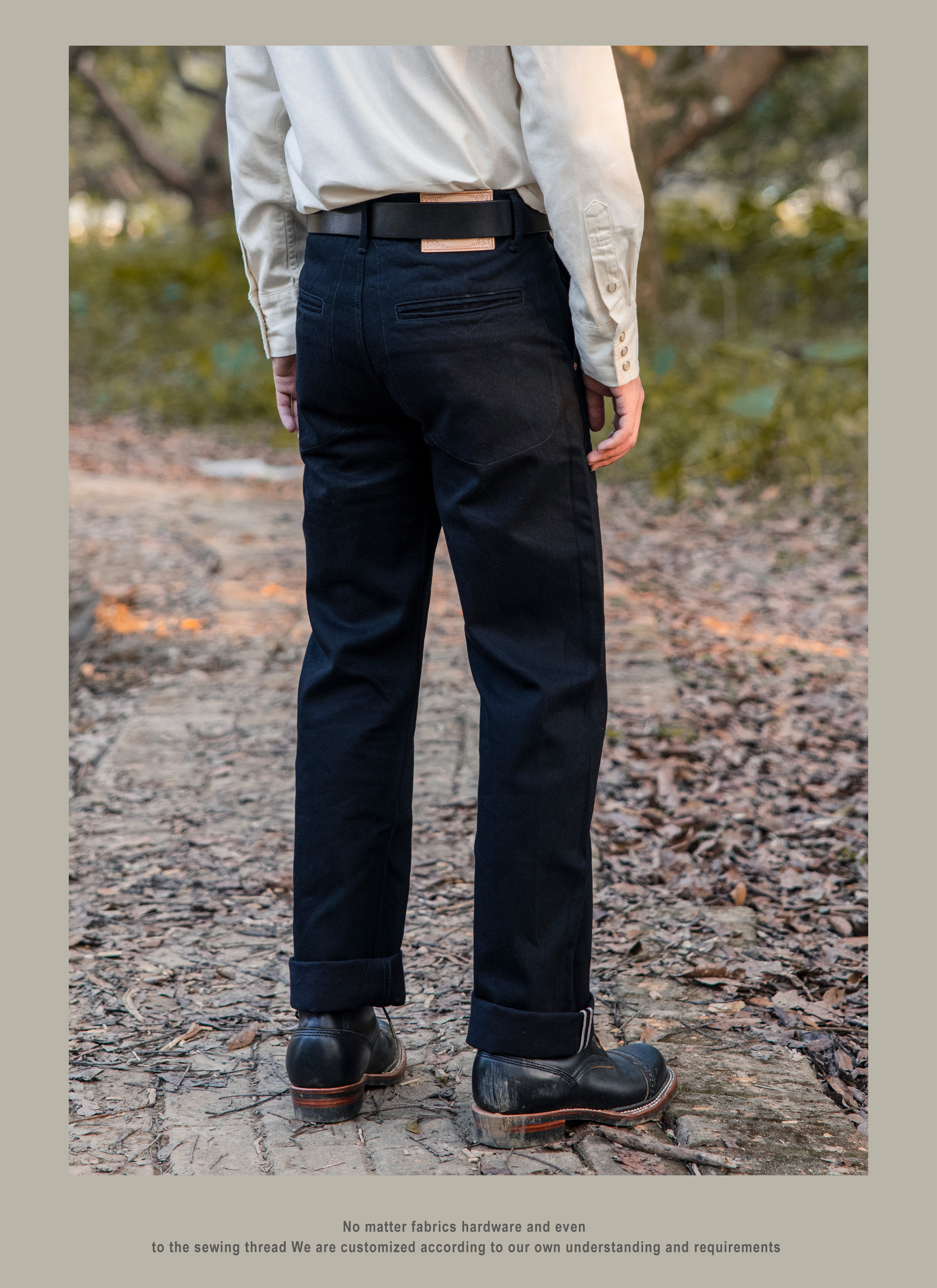 SPECIFICATIONSApplicable Scene: DailyApplicable Season: Spring And AutumnBrand Name: RedTornadoCN: GuangdongClosure Type: Button FlyCountry Preference: AsiaCraft of Weaving: TatDecoration: ButtonElasticity: Non StrechFabric Type: SoftenerFit Type: LooseGender: MenHign-concerned Chemical: NoneItem Type: JEANSJeans Style: Boyfriend JeansLength: full lengthMaterial: DenimModel Number: DN-0002Origin: Mainland ChinaPattern Type: SolidSpecial Size: Standard SizeStyle: CasualThickness: HeavyweightWaist Type: MIDWash: Nosize_info: {"sizeInfoList":[{"length":{"cm":"104","inch":"40.94"},"size":"S","vid":-1},{"length":{"cm":"110","inch":"43.31"},"size":"M","vid":-2},{"length":{"cm":"116","inch":"45.67"},"size":"L","vid":-3},{"length":{"cm":"122","inch":"48.03"},"size":"XL","vid":-4},{"length":{"cm":"128","inch":"50.39"},"size":"XXL","vid":-5}]}Original designWe have jeans factoryOem/Odm service availableWholesale / drop shipper welcome14 oz cotton fabricUnsanforised / unwashed100% indigo dyedCow leather patchIf you are not sure about the size,please measure your pants as below