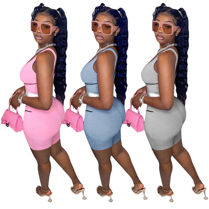 Knitted Ribbed Striped 2 Piece Sets Summer Outfits for Women 2023 Crop Top and Shorts Casual Matching Sets Sportwear Sweatsuits
