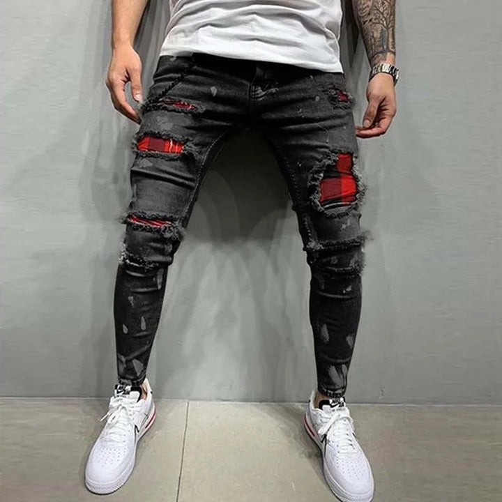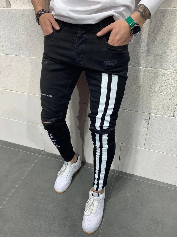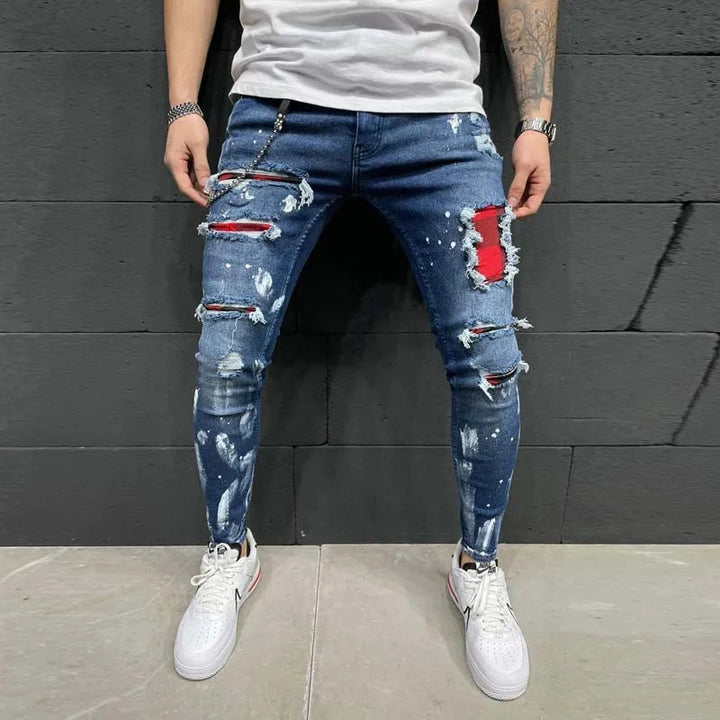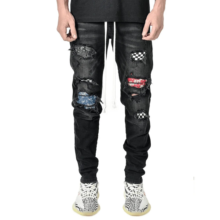 Mens Distressed Pleated Knee Patch Painted Stretch Skinny Jeans Ripped Denim Pants Brand Hip Hop Black Casual Trousers for men