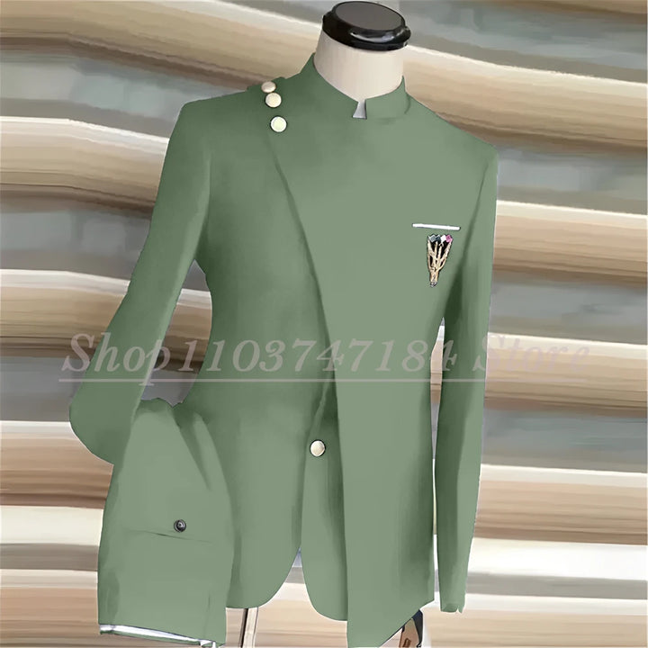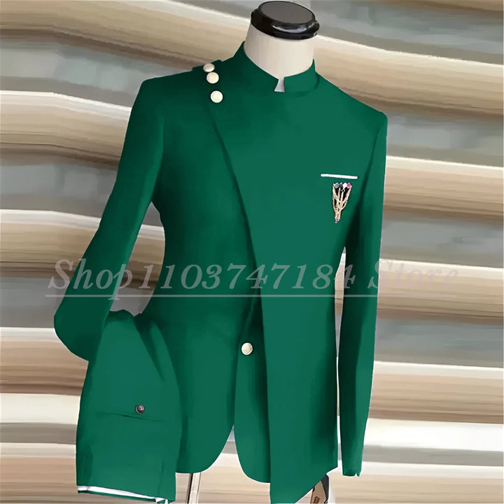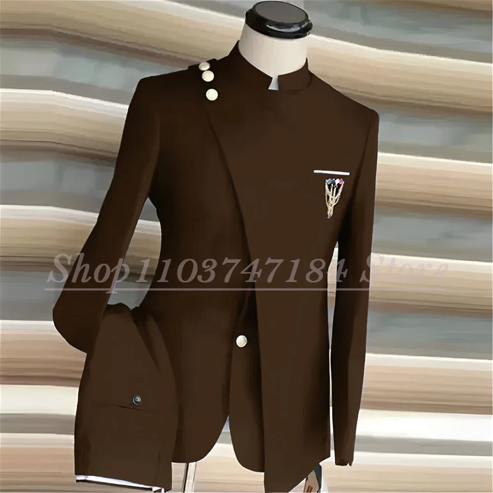 Navy Blue Men's Suits Single Breasted Stand Lapel Blazer African Style Formal Occasion Party 2 Piece Jacket Pants Costume Homme