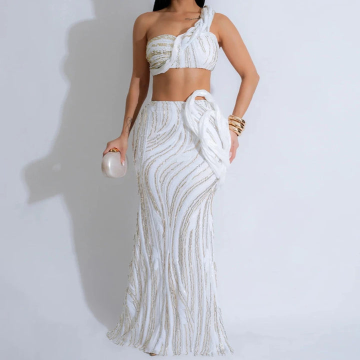 SPECIFICATIONSActual Images: YesAge-targeted: All AgeBrand Name: Snow masterCN: GuangdongCraft of Weaving: KnitDecoration: Ruched,Sequined,Tiered,PleatDress: Women's dressDresses Length: Floor-LengthElegant gowns: Summer dressElegant party dresses: ropa para mujerEvening dresses: ropa mujerFabric Type: SequinFashion Element: Crop TopHign-concerned Chemical: NoneHoliday Oriented: CommonlyItem Type: Prom DressesMaterial: POLYESTERMidi dresses: new in dressesNeckline: One-ShoulderNew dress: midi dressesOccasion: PromOrigin: Mainland ChinaParty dresses: vestidos elegantesPattern Type: FloralSilhouette: A-LINESleeve Length(cm): SleevelessSleeve Style: One-ShoulderStyle: ExquisiteThickness: StandardWaistline: NaturalWoman clothes: woman clothesWoman clothing: Plus size women's clothingdress: long dresseselegant party dresses 2025: vestido femininoselegant women's dresses: vestidos midievening dress woman: summer dressevening dresses: vestidos...