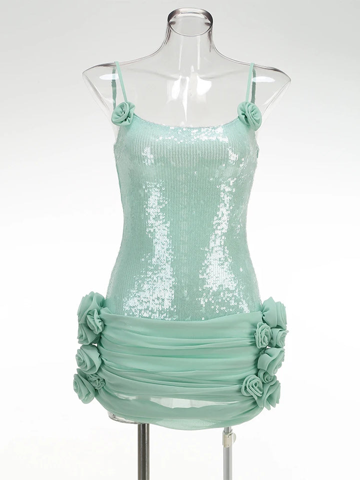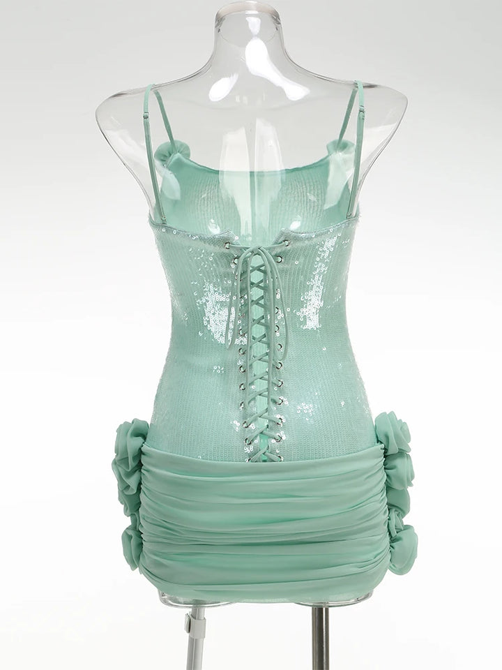 Sexy Spaghetti Strap Backless Prom Dresses for Women Luxury 2025 Summer Sequins Flower Lace-up Pleated Mini Dress Elegant Gowns