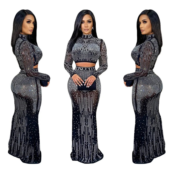 Sexy Sparkling Silver Rhinestone Chain Pearl Transparent Dress Birthday Party Evening Dress Prom Dress Bright Drill Skirt Suit