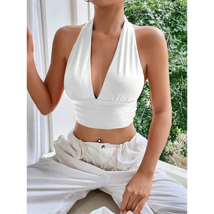Sleeveless Backless Deep V-neck Halter Top Women Summer 2025 Club Party Sexy Solid Color Crop Tops Streetwear Y2K Clothes