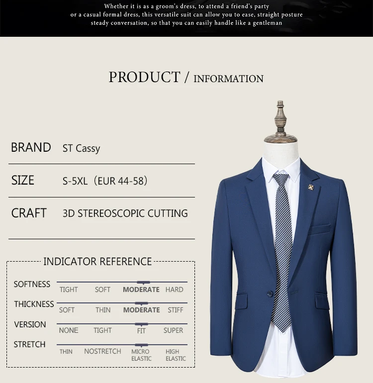SPECIFICATIONSApplicable Scene: OfficeApplicable Season: Four SeasonsBrand Name: ST CassyCN: GuangdongClosure Type: Single BreastedClothing Length: RegularCraft of Weaving: KnitGender: MenHign-concerned Chemical: NoneMaterial: POLYESTER,RayonOrigin: Mainland ChinaStyle: Formalwhether full opening: Yes