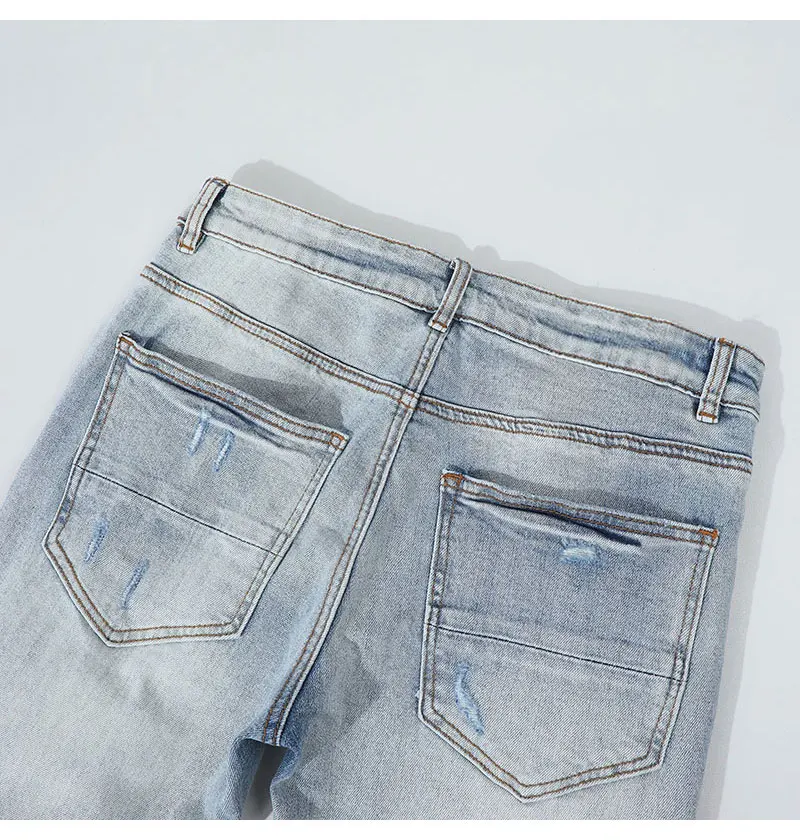 Street Fashion Men Jeans Retro Light Blue Stretch Skinny Fit Ripped Jeans Men Pink Leather Patched Designer Brand Hip Hop Pants