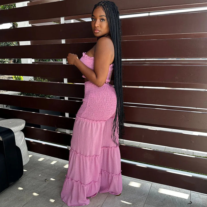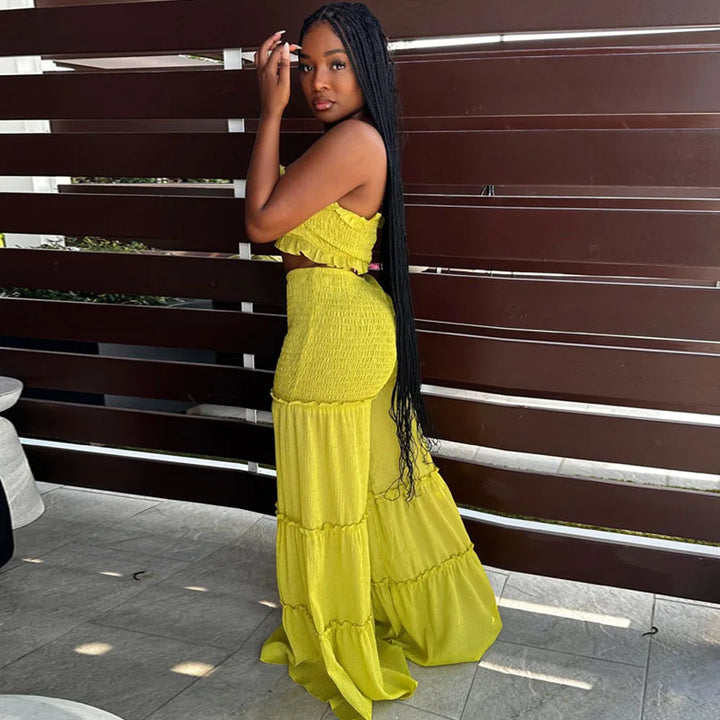 Women Summer Sexy Outfits 2pc Boho Pant Sets Ruffled Two Pieces Pants Set Ladies Strapless Crop Tube Top and Wide Leg Pants Suit