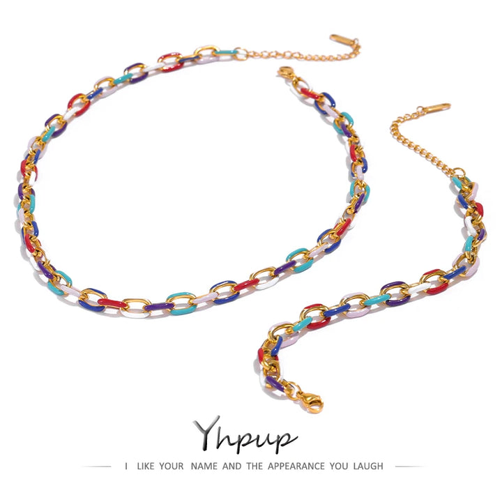 Yhpup Rainbow Enamel Chain Necklace Bracelet Set 316L Stainless Steel 18 K PVD Plated Set Waterproof Jewelry Y2K Party Gift
